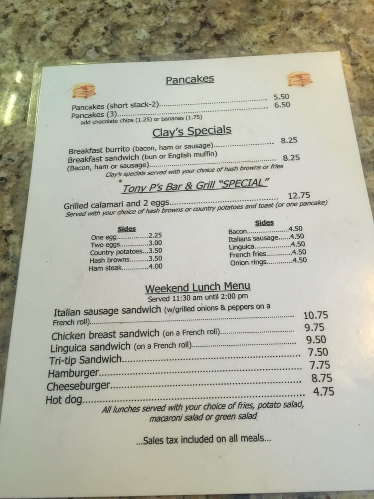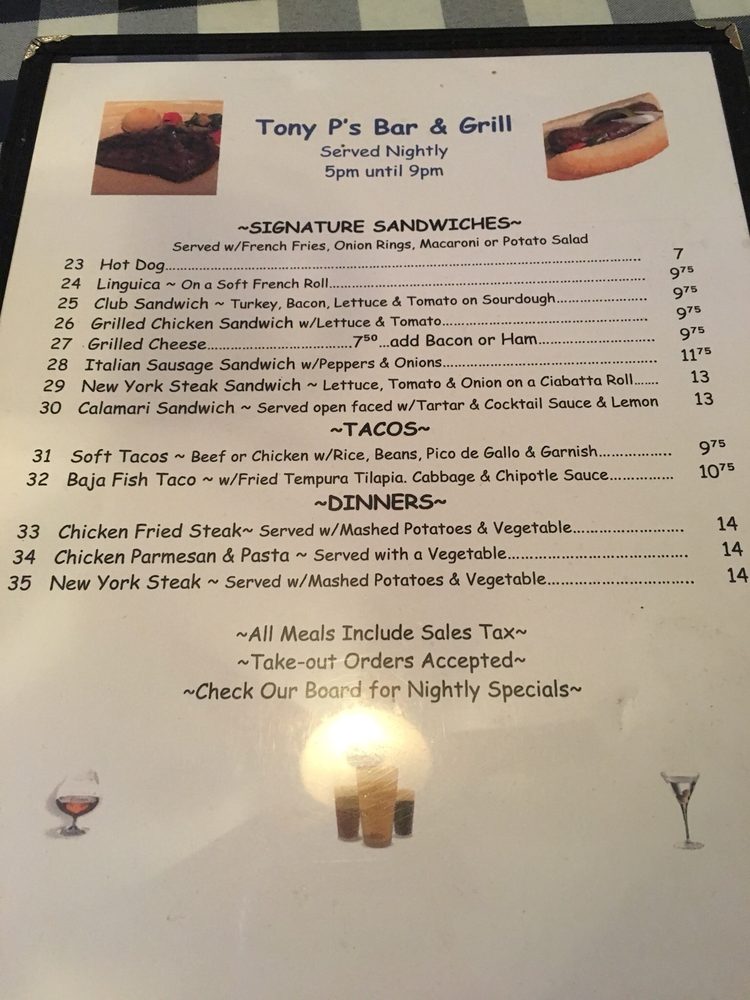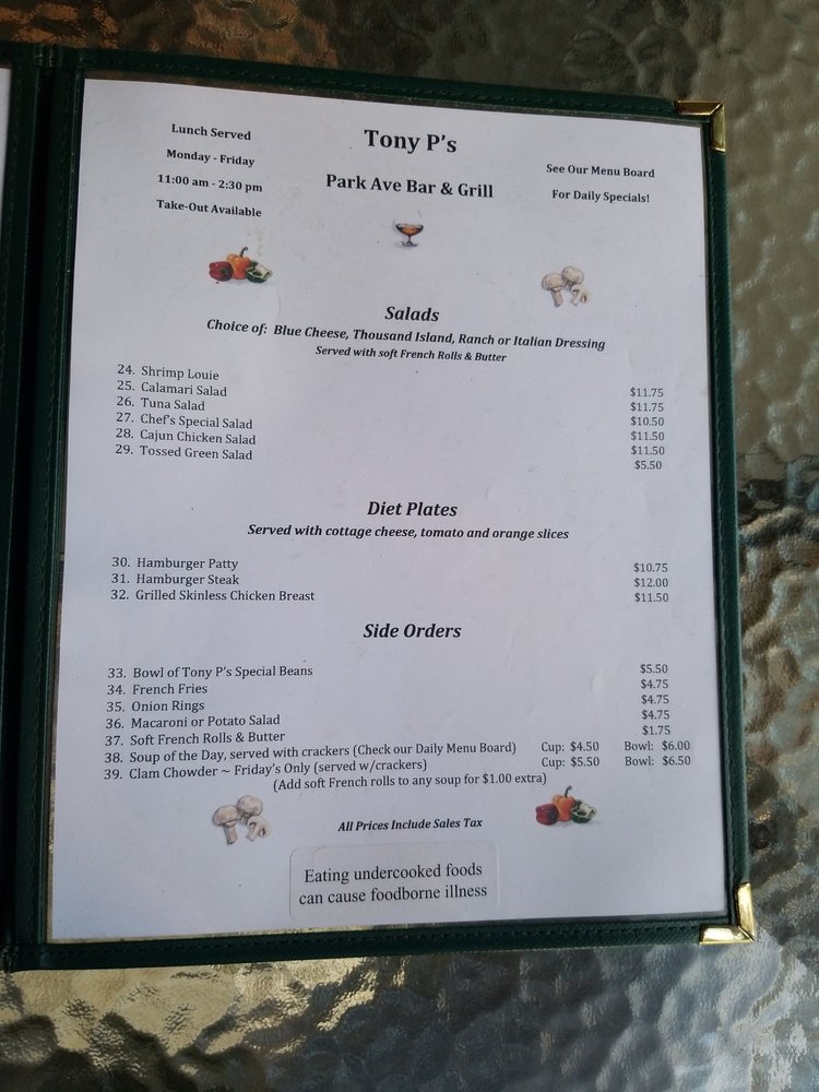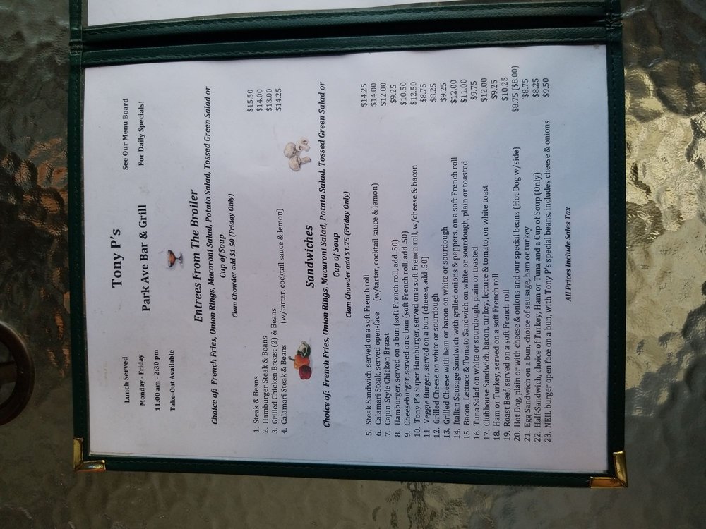 Tony P's Park Ave Bar & Grill Menu