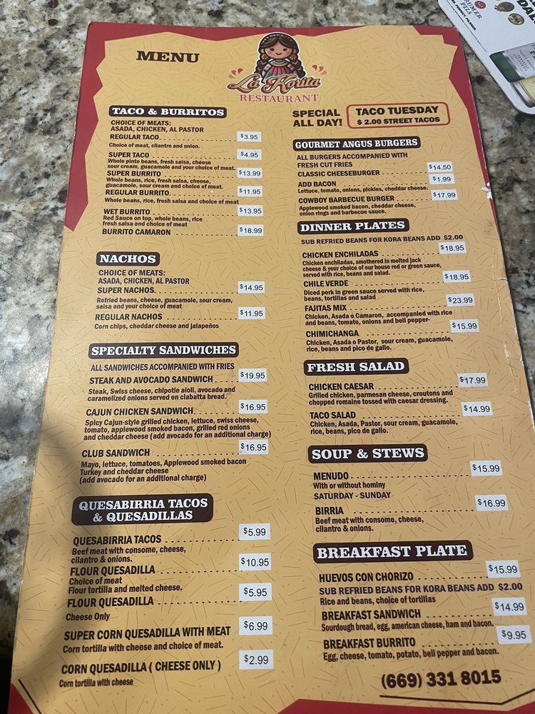 - Breakfast Highlights: Start your day with a hearty Breakfast Burrito or Breakfast Tacos.